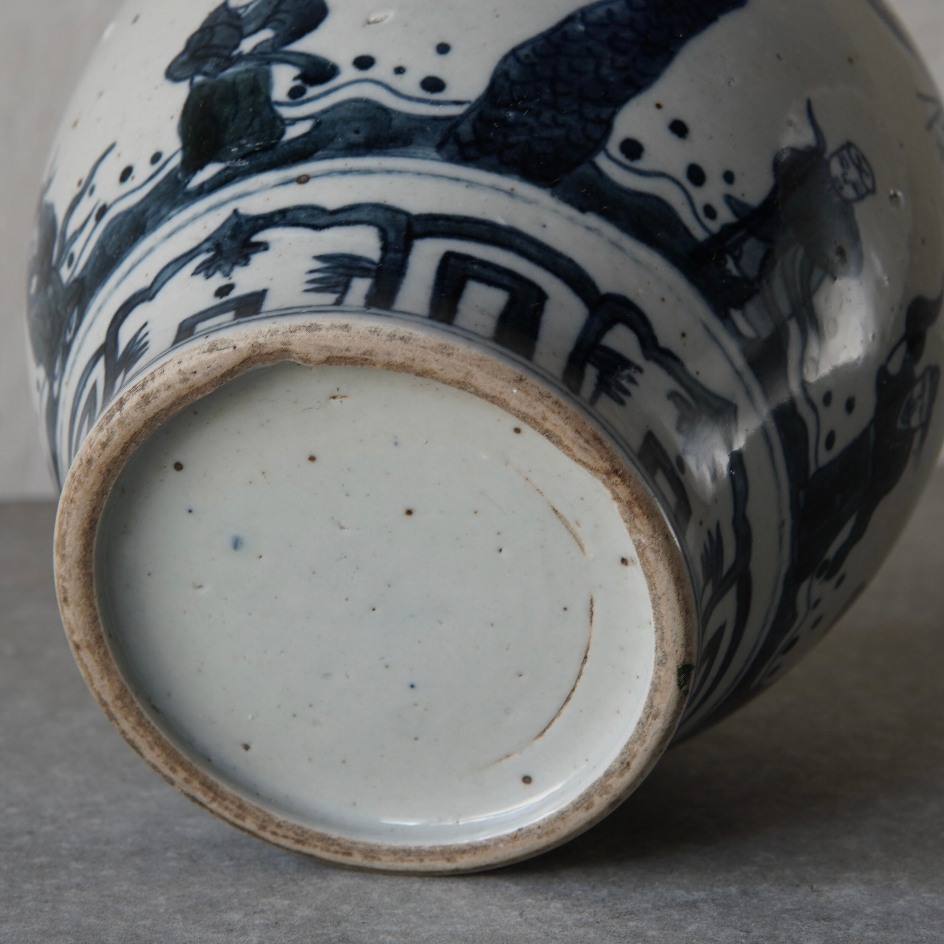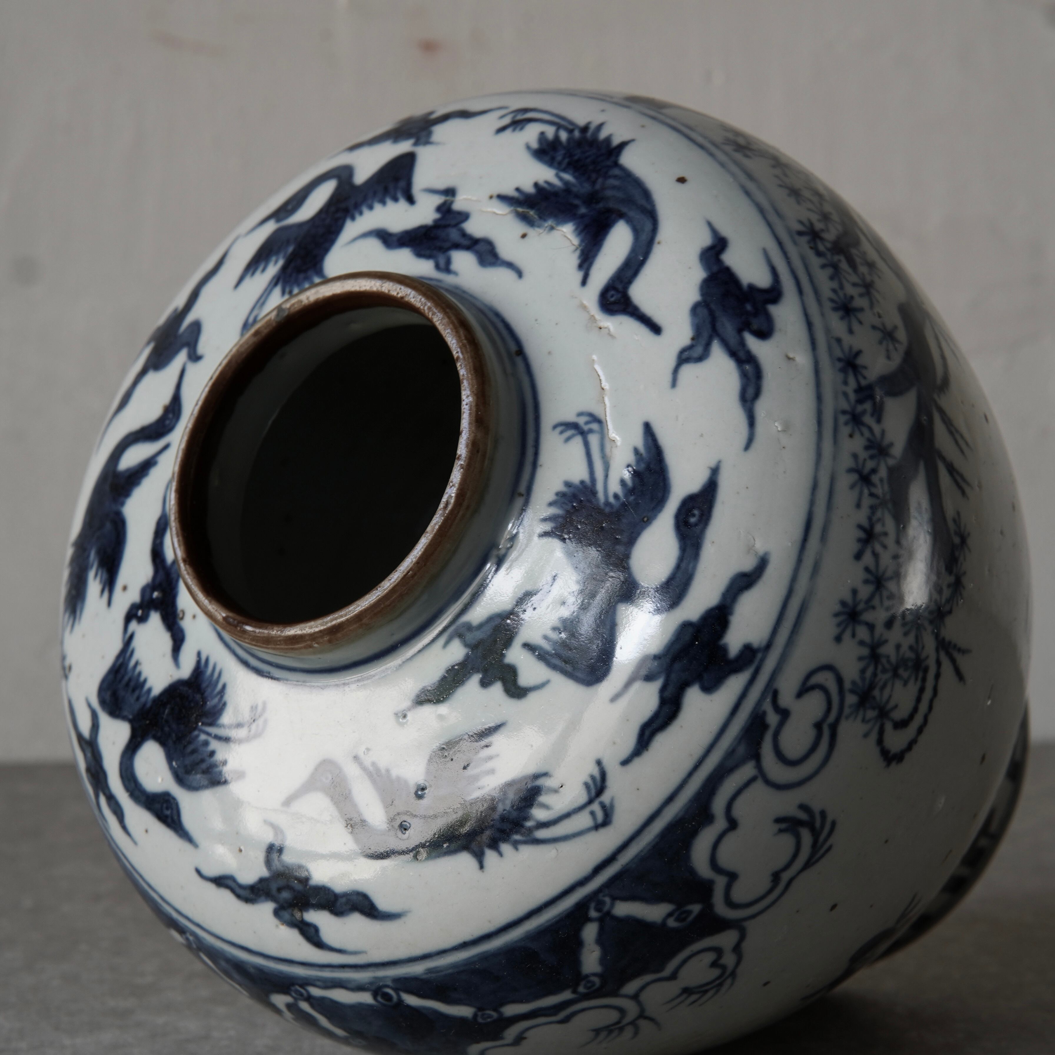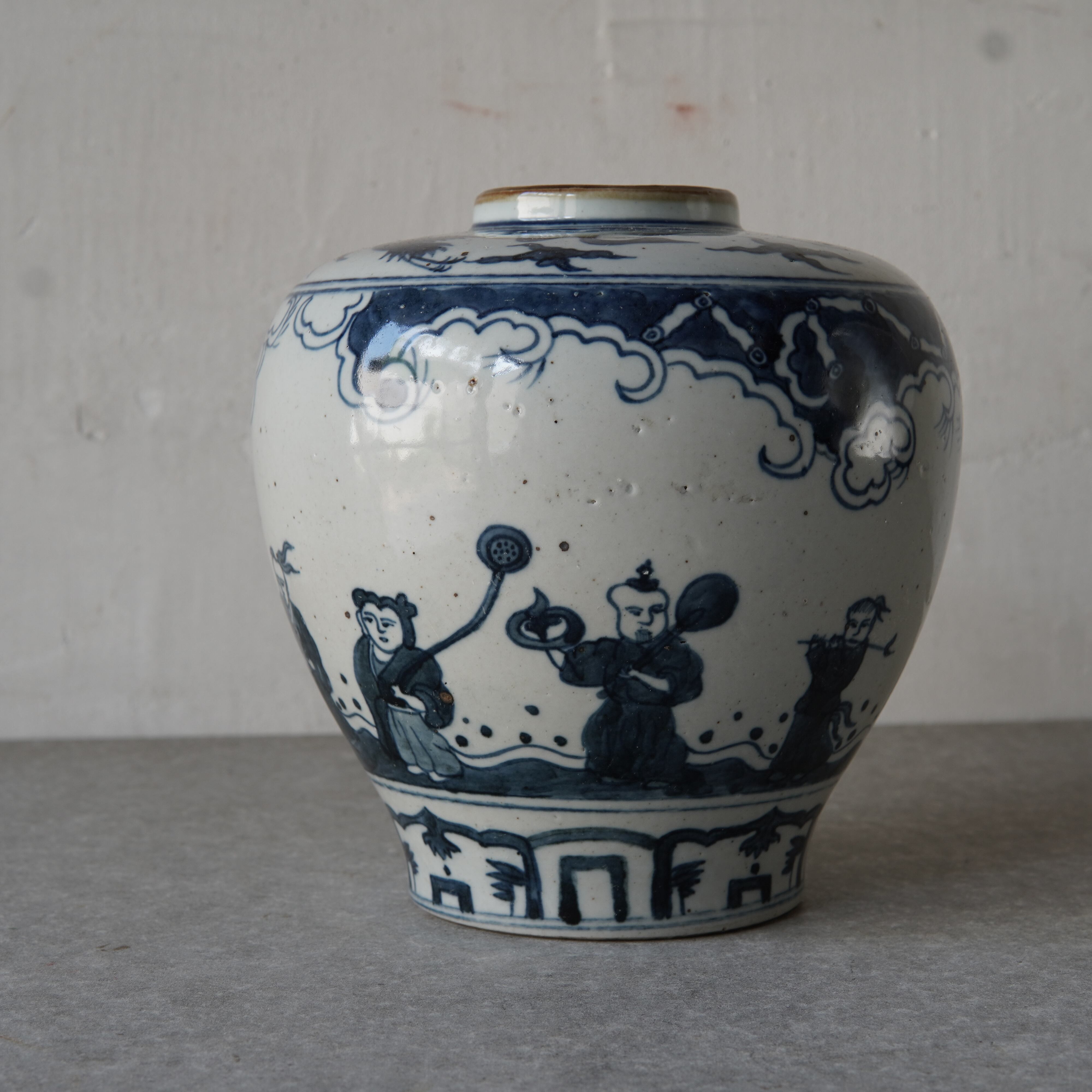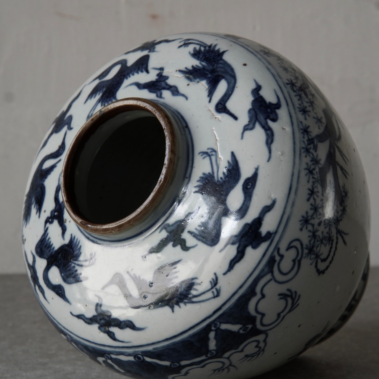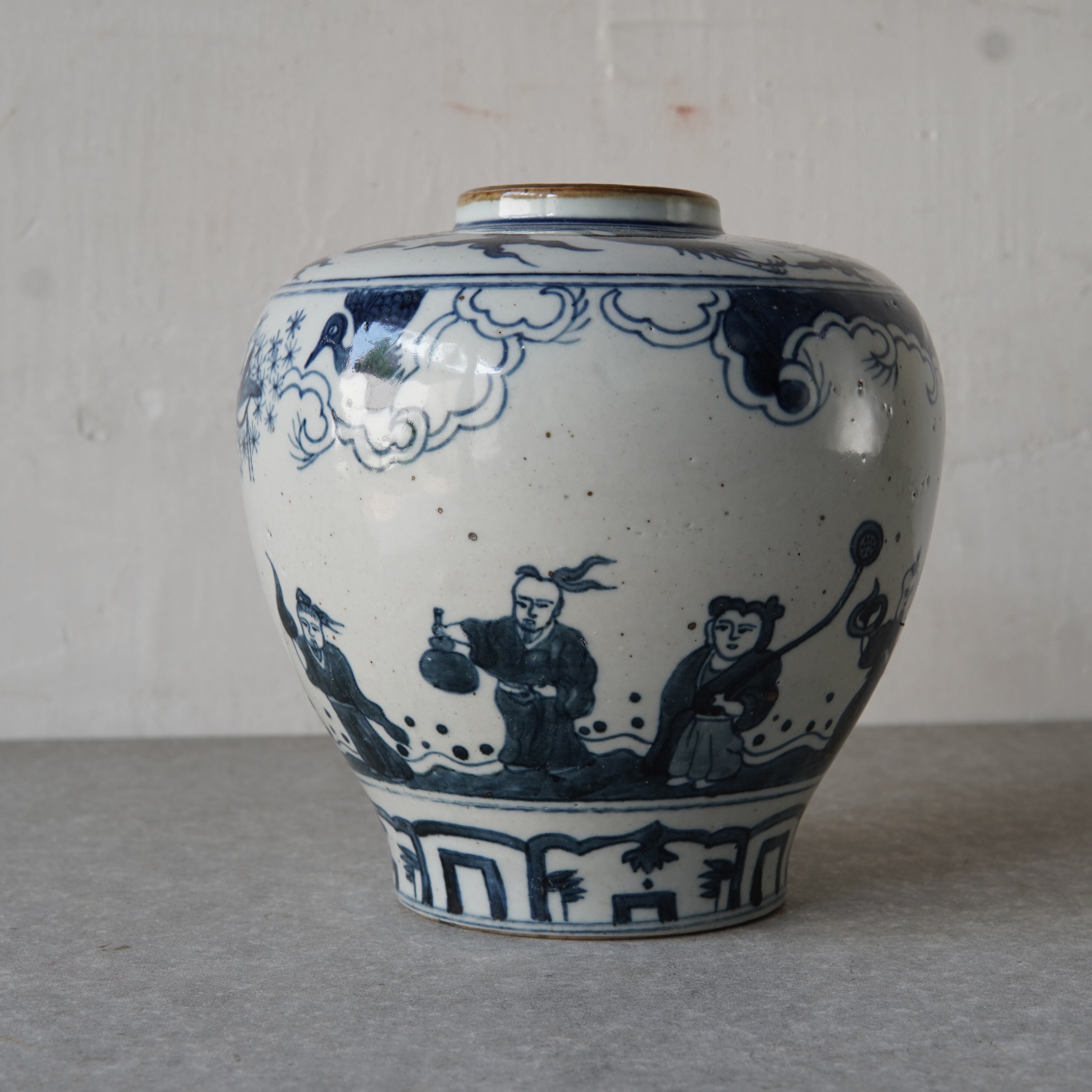 竹林七賢人文の描かれた古染付壺。上部には空を舞う鶴の一群も描かれています。