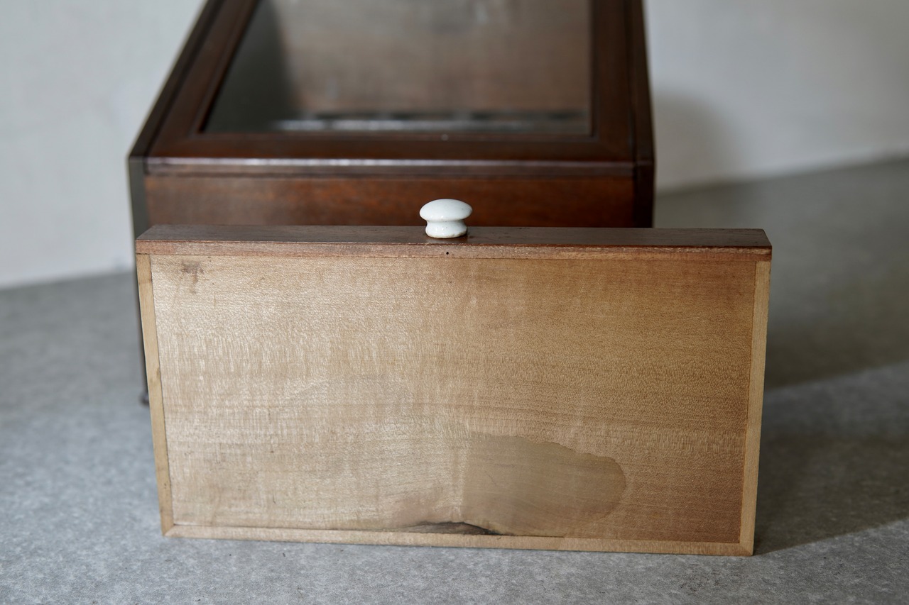 ガラス蓋はスライドして収納可能で、前方側面は折り畳んで台になり小さな引出しも機能的です。落ち着いた色合いで、ガラスも揺らぎのあるオリジナルで魅力的。コレクションケースやアクセサリー入れとして良い雰囲気です。
