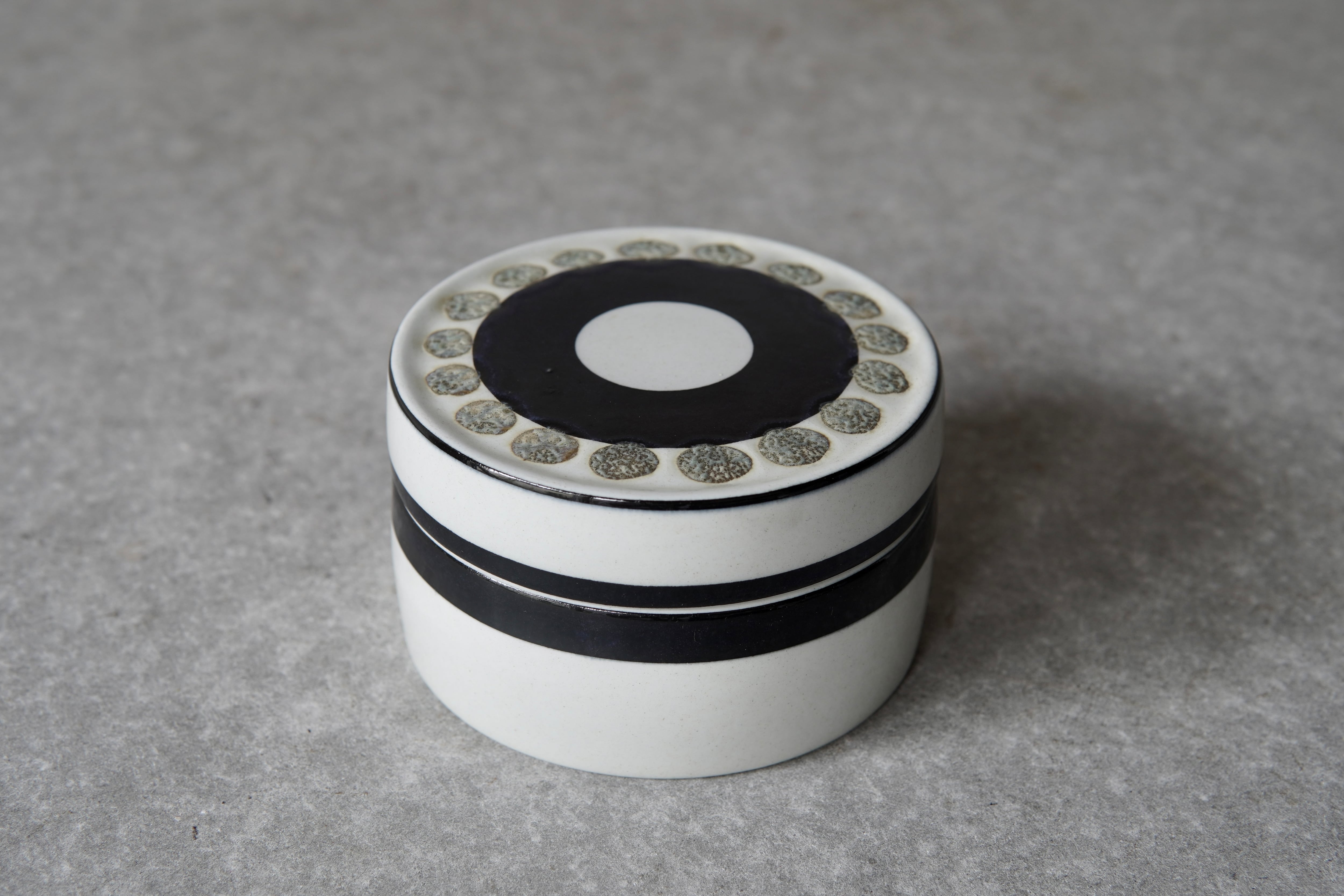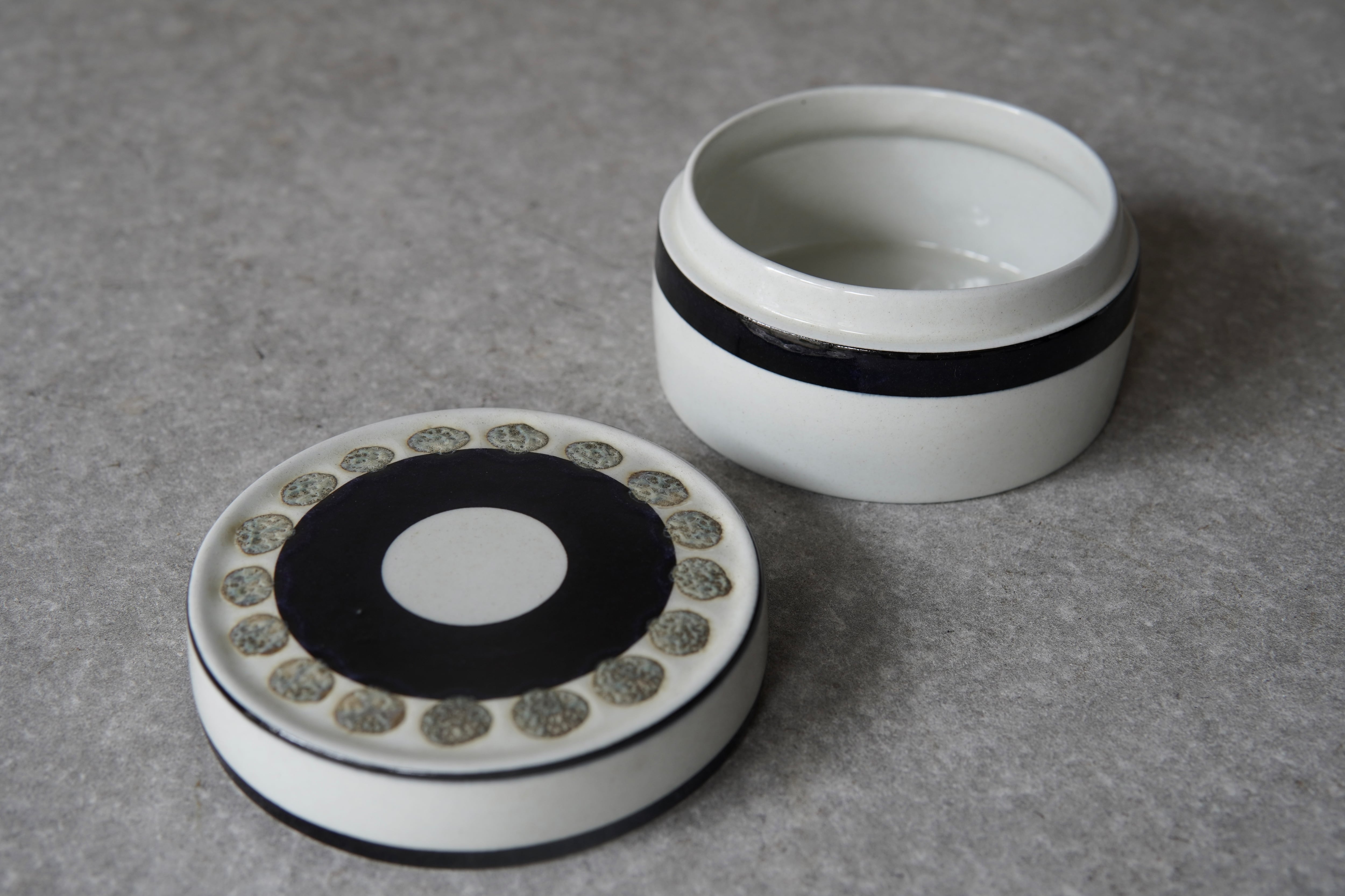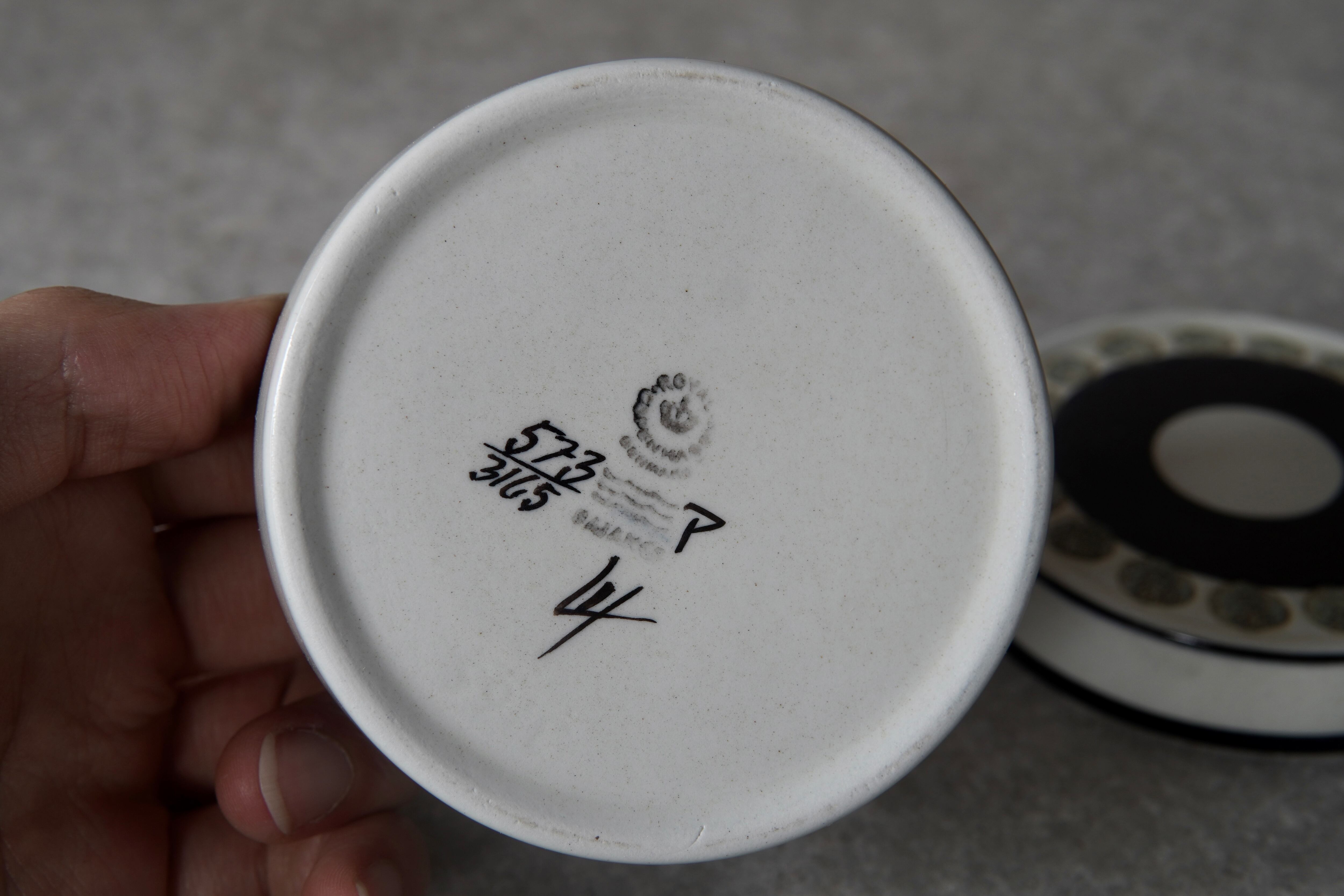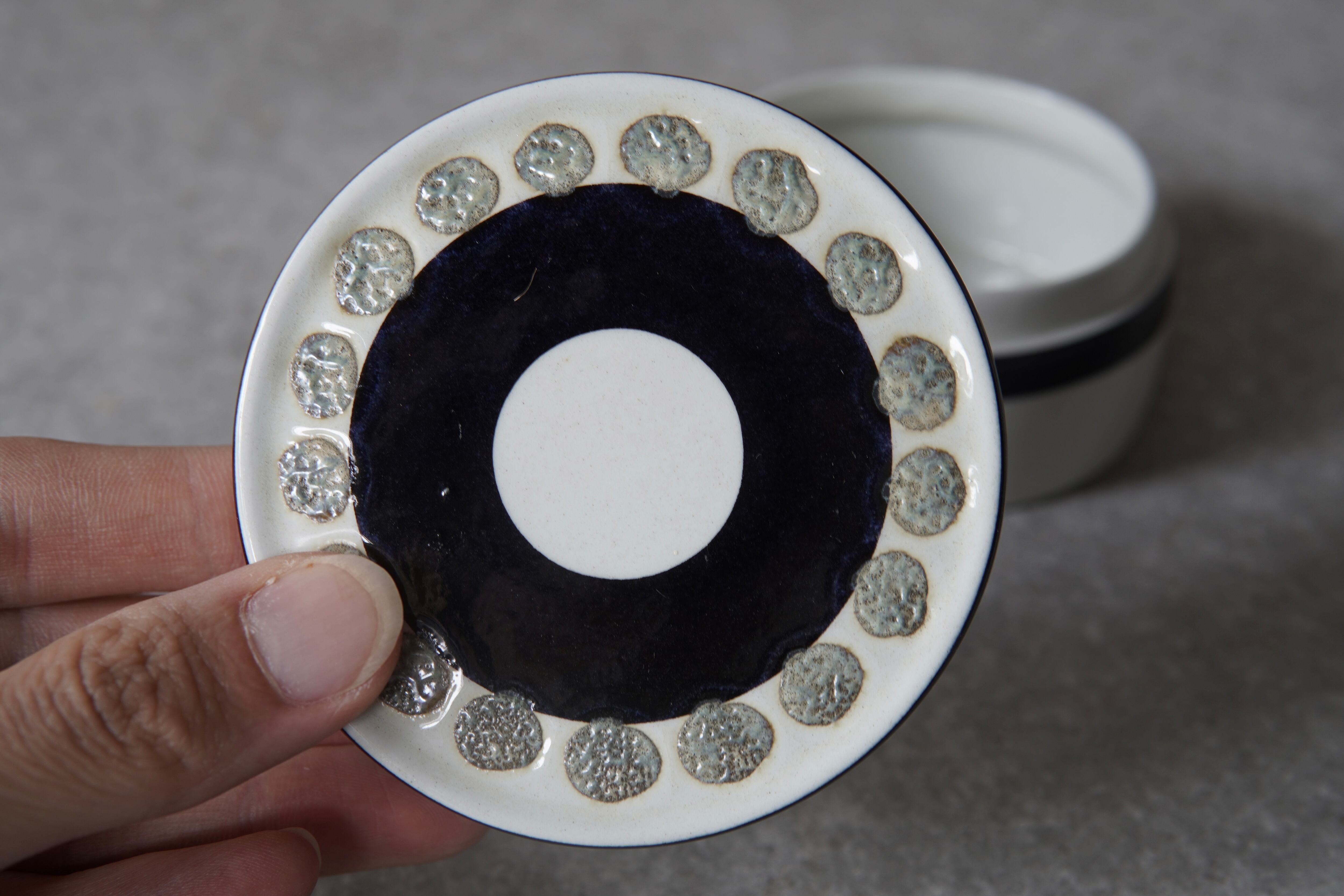 こちらの蓋付きケースは、Inge-Lise-Koefoed(インゲ・リセ・コェフォード)によるデザイン。ファイアンスと呼ばれる低温で焼く製法でつくられ、土っぽさのある絵付けが施されています。上品な佇まいなので、小物入れやアクセサリーケースなどにも。