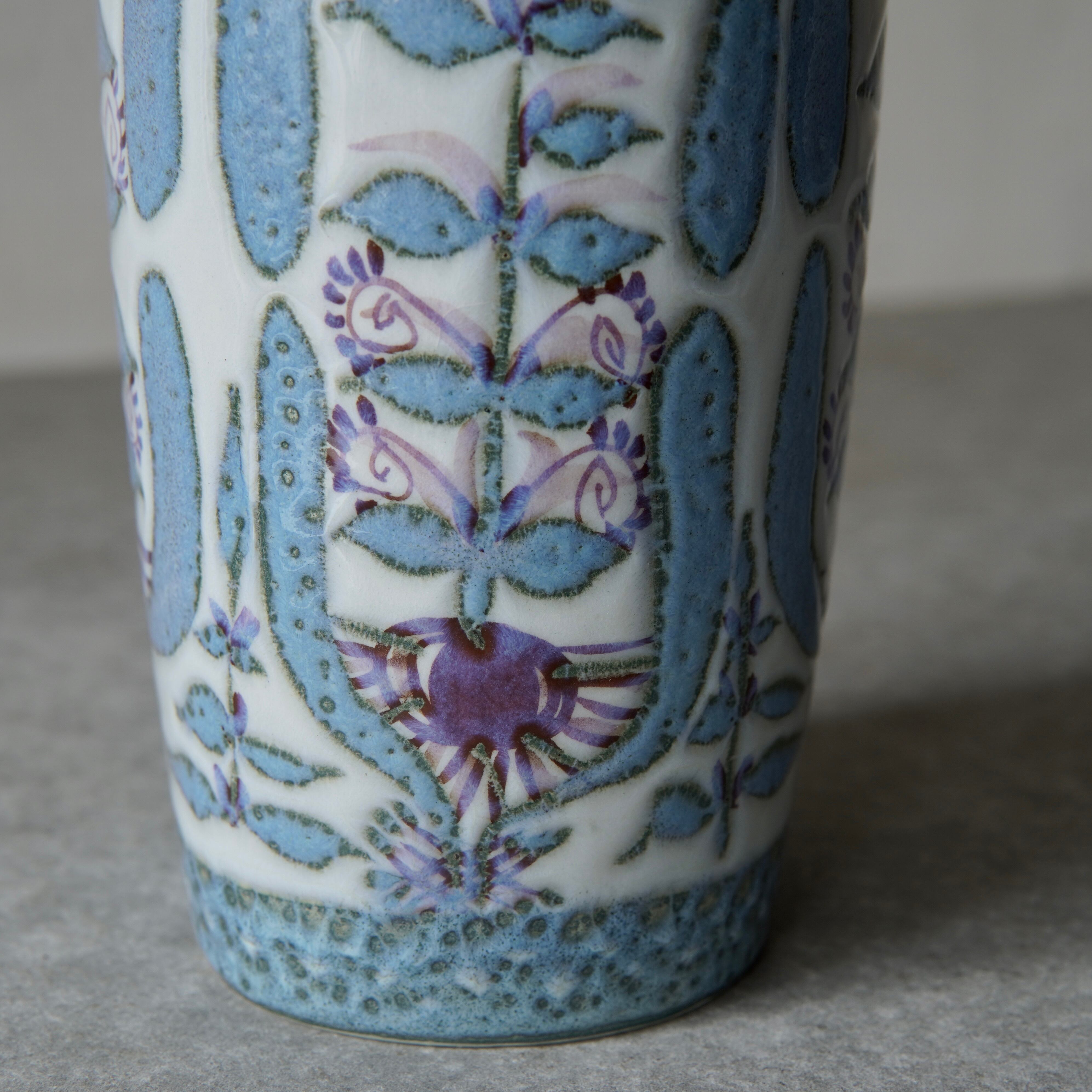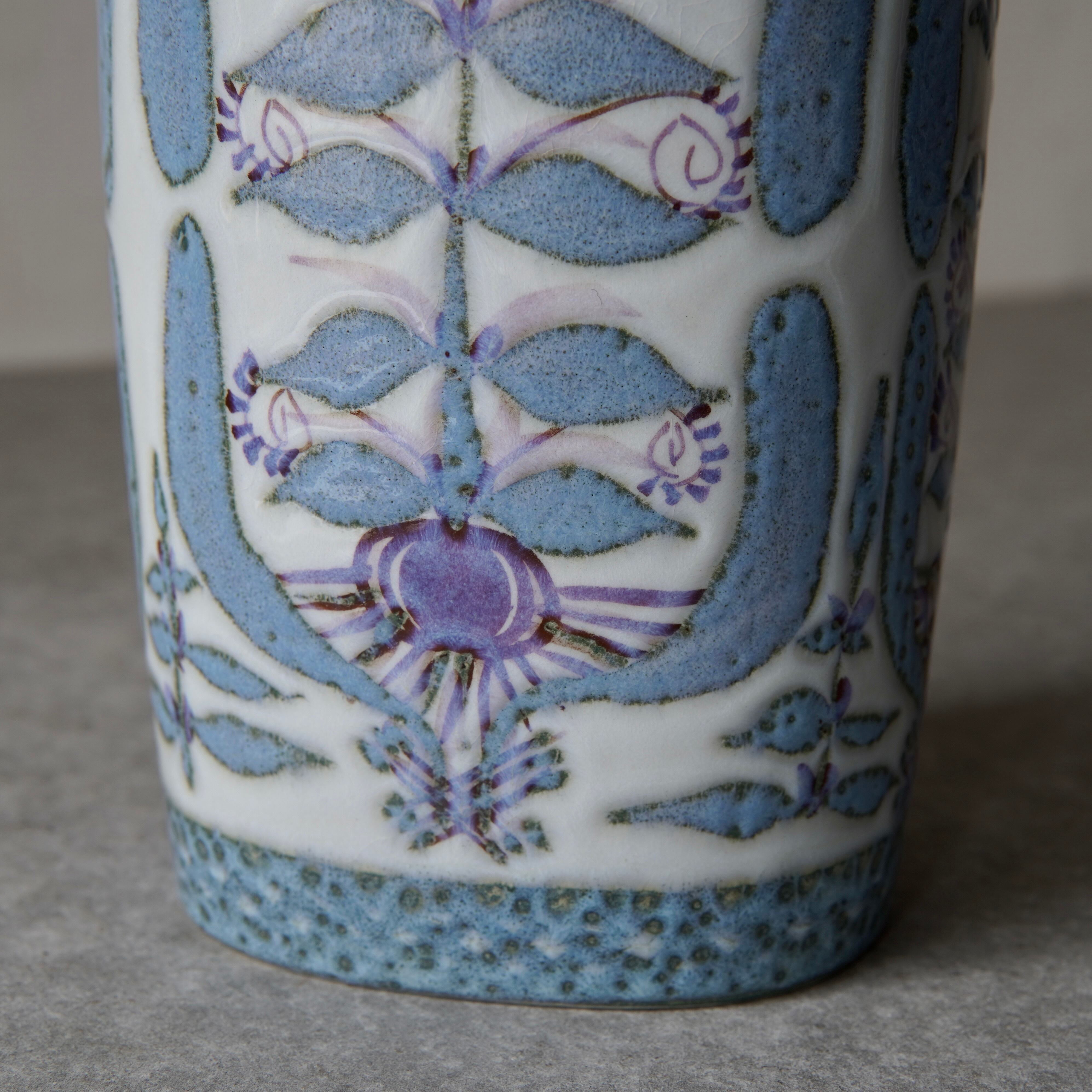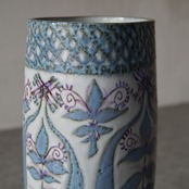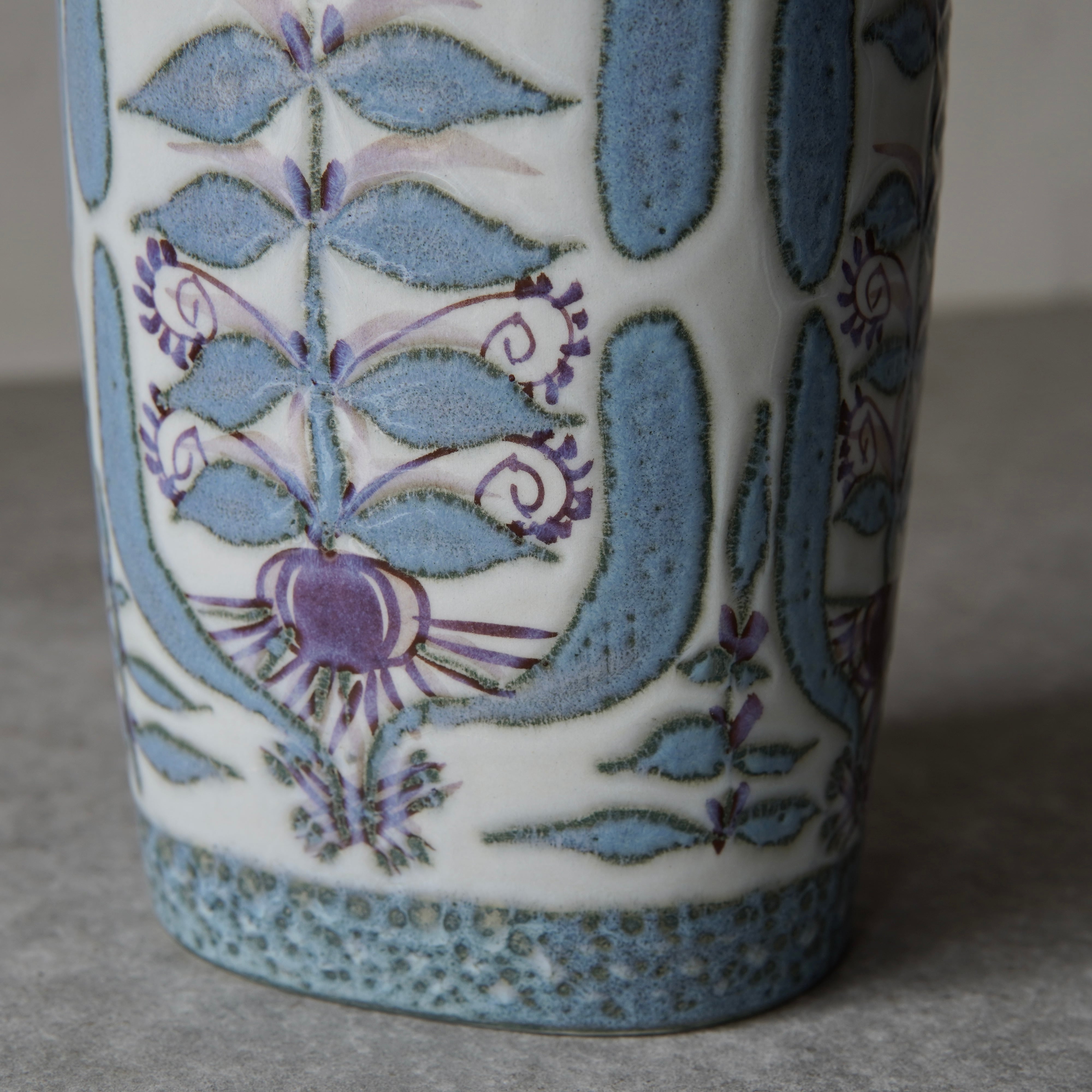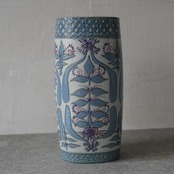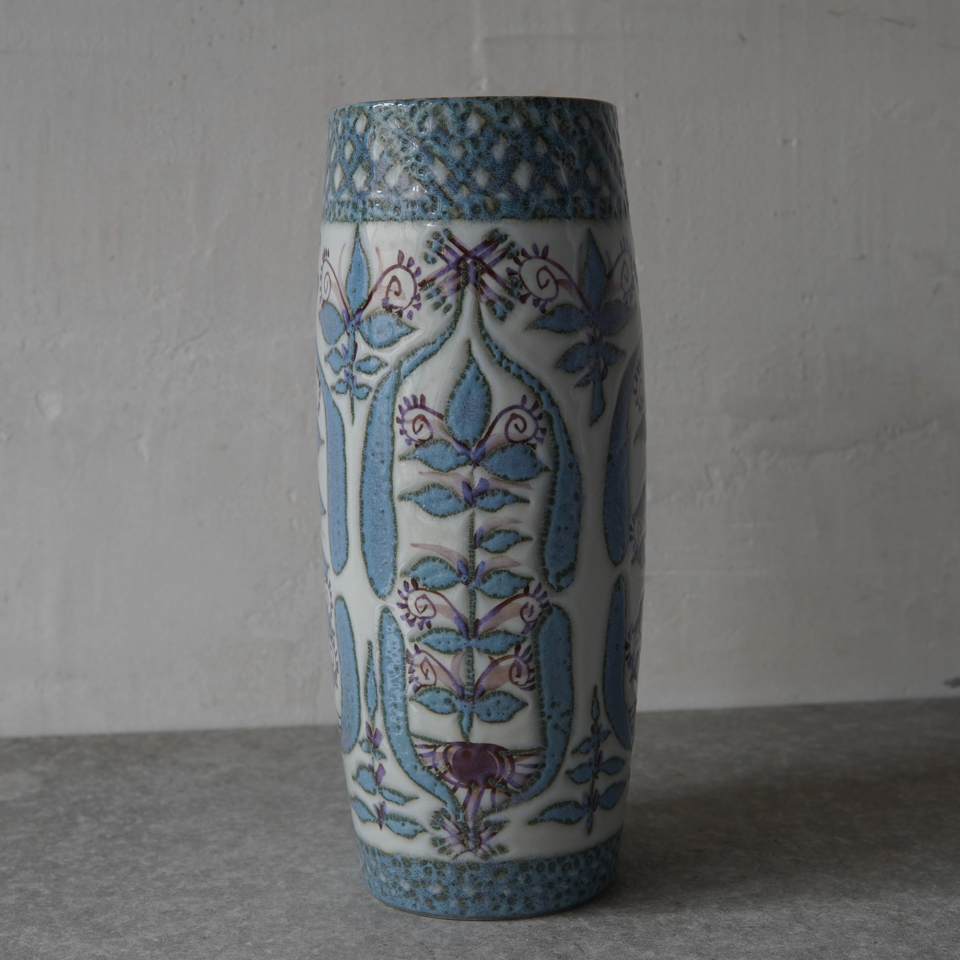 こちらの花瓶はMarianne Johnson(マリアンヌ・ジョンソン)によるデザイン。植物などの図柄がペールブルーやパープルでペインティングされています。しっとりとして上品な印象ながら、華やかな存在感も纏った花瓶です。