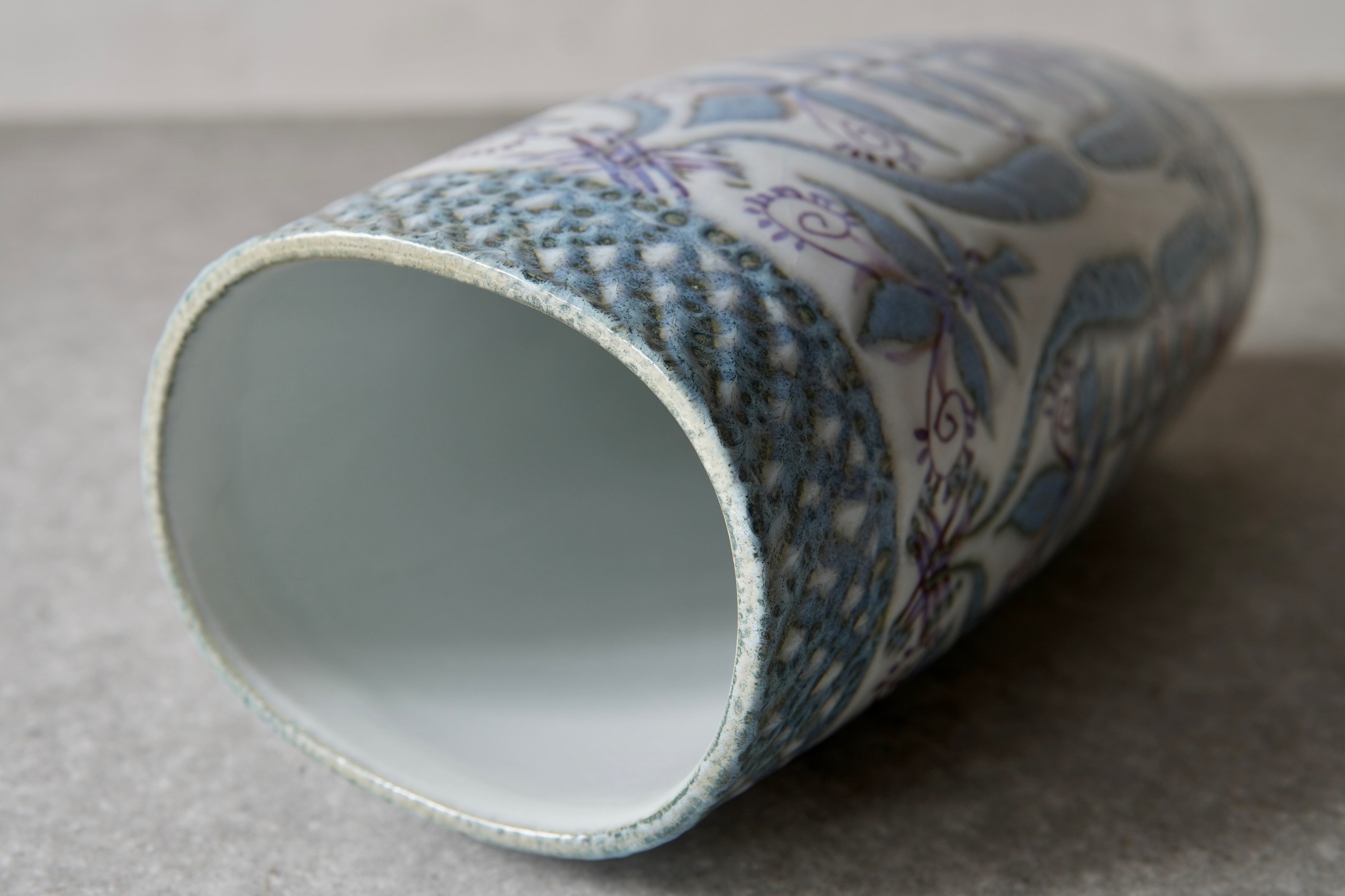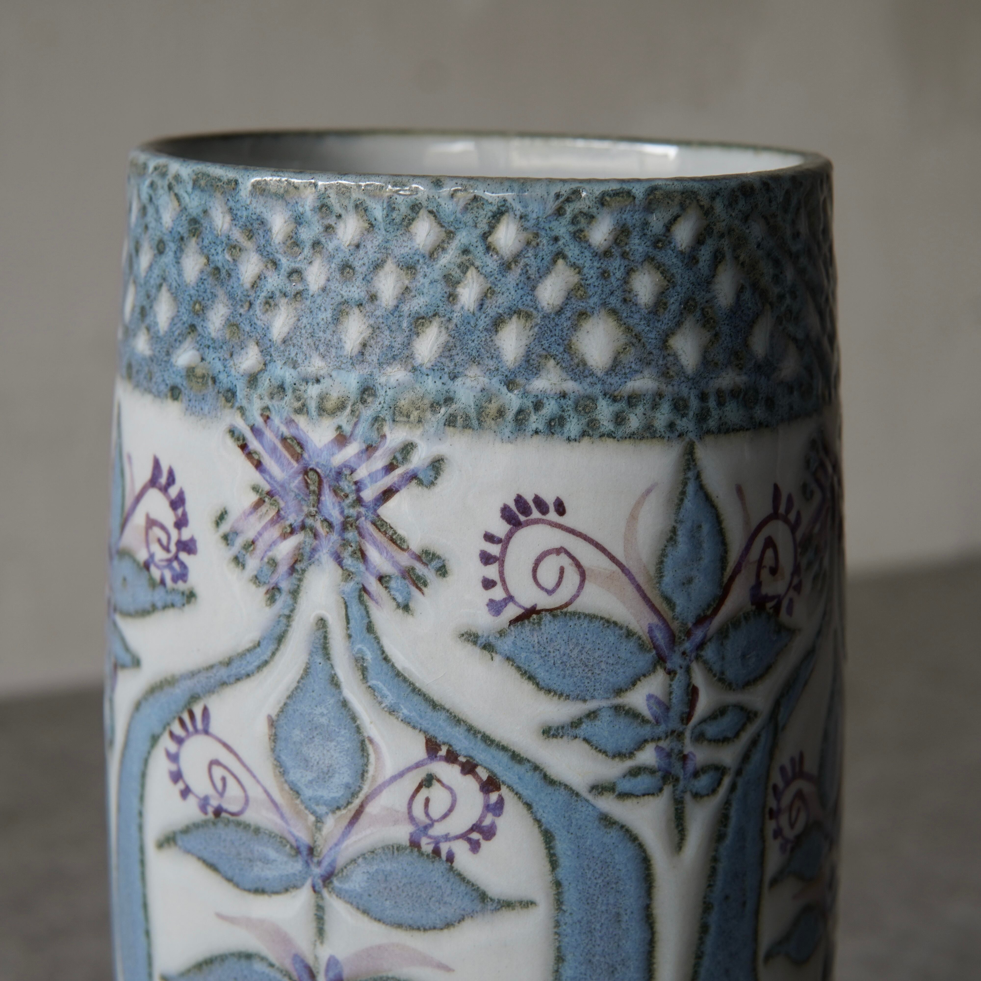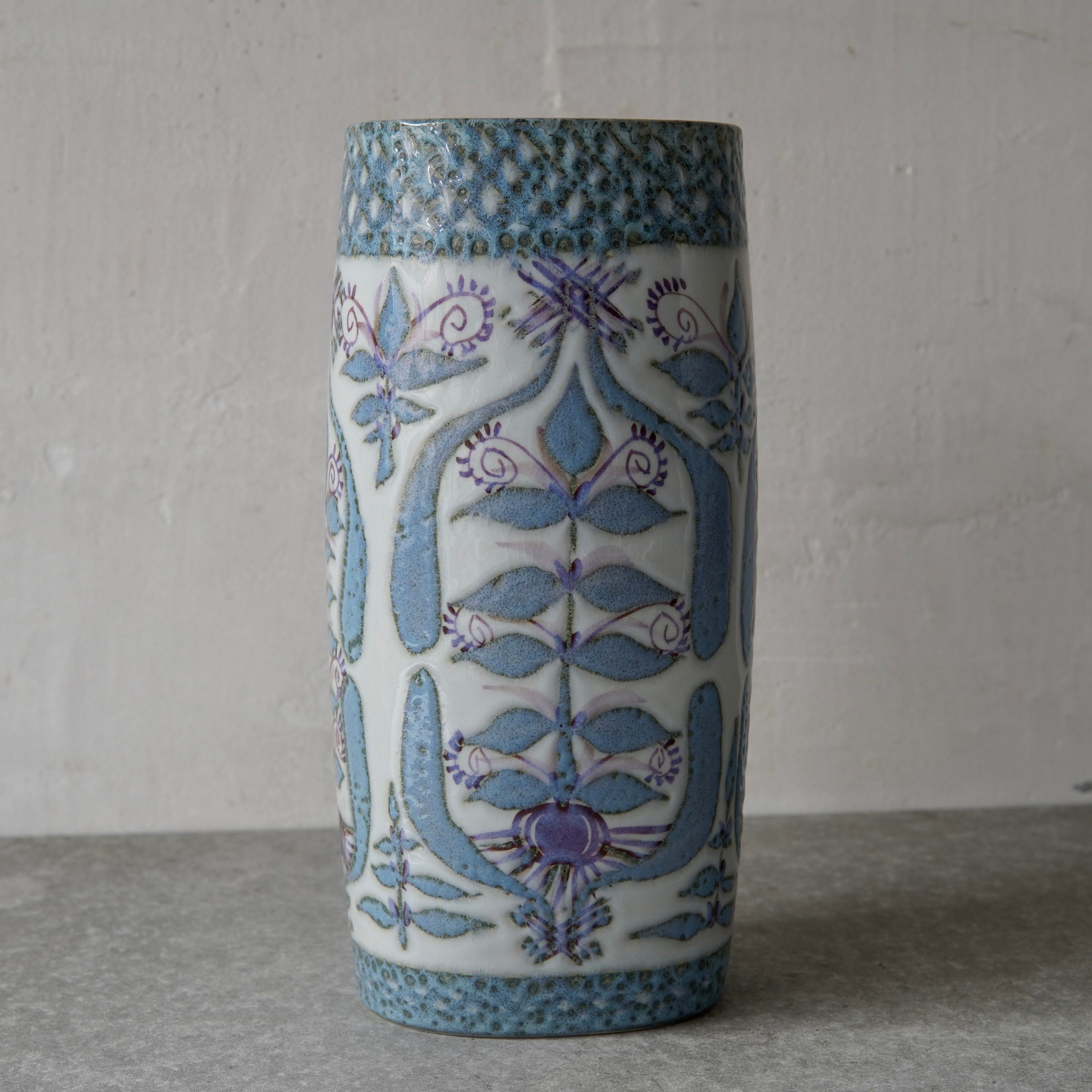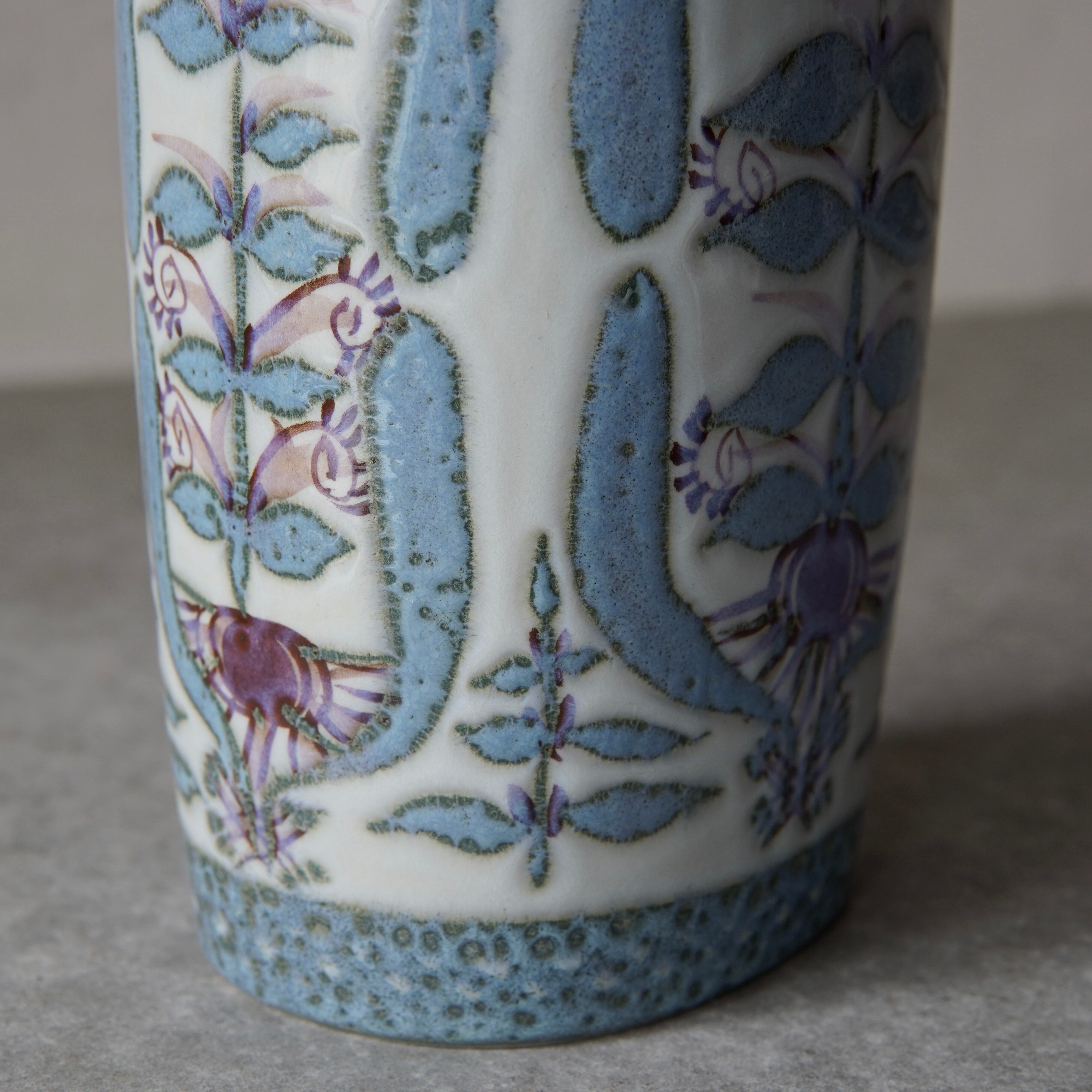 こちらの花瓶はMarianne Johnson(マリアンヌ・ジョンソン)によるデザイン。植物などの図柄がペールブルーやパープルでペインティングされています。しっとりとして上品な印象ながら、華やかな存在感も纏った花瓶です。