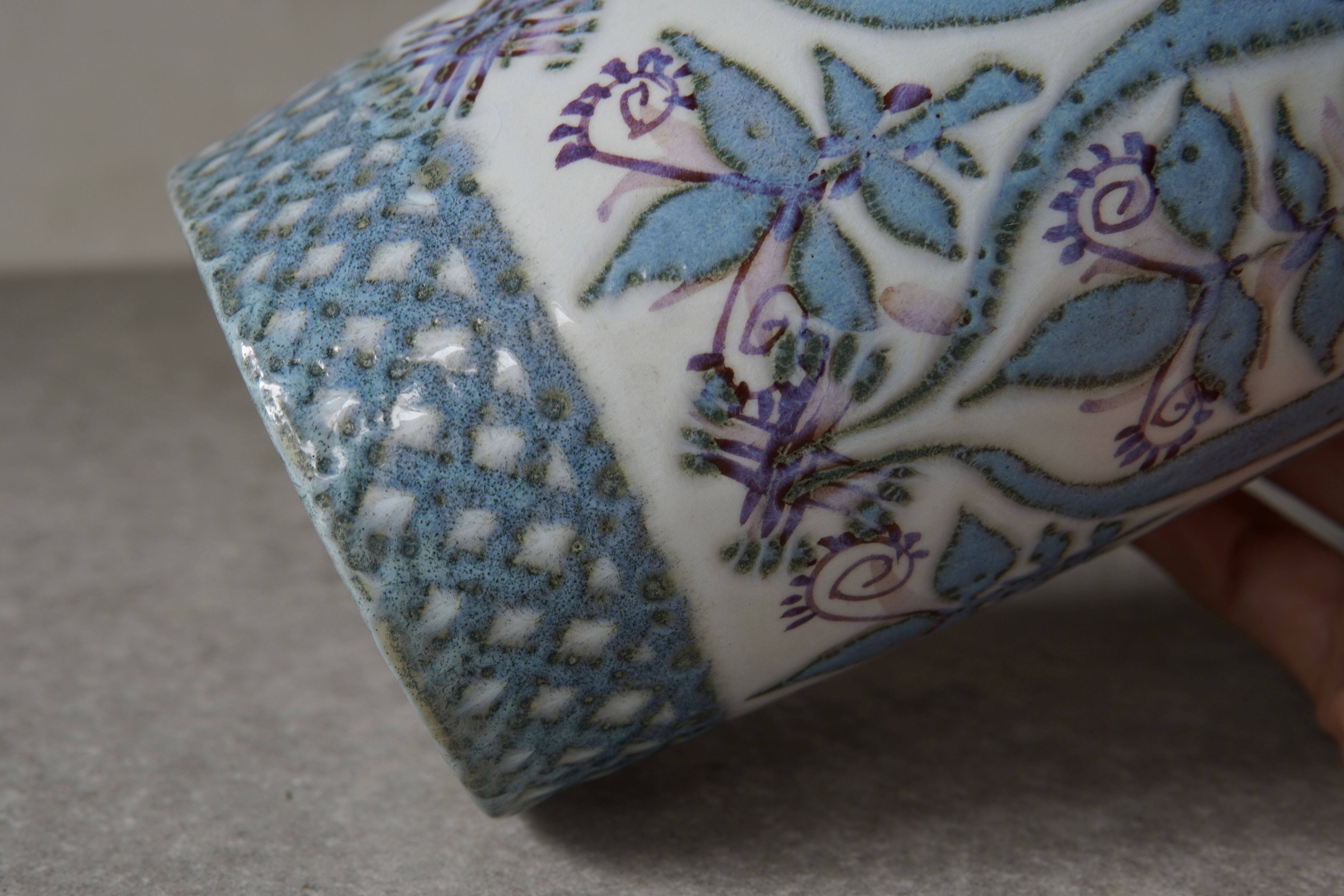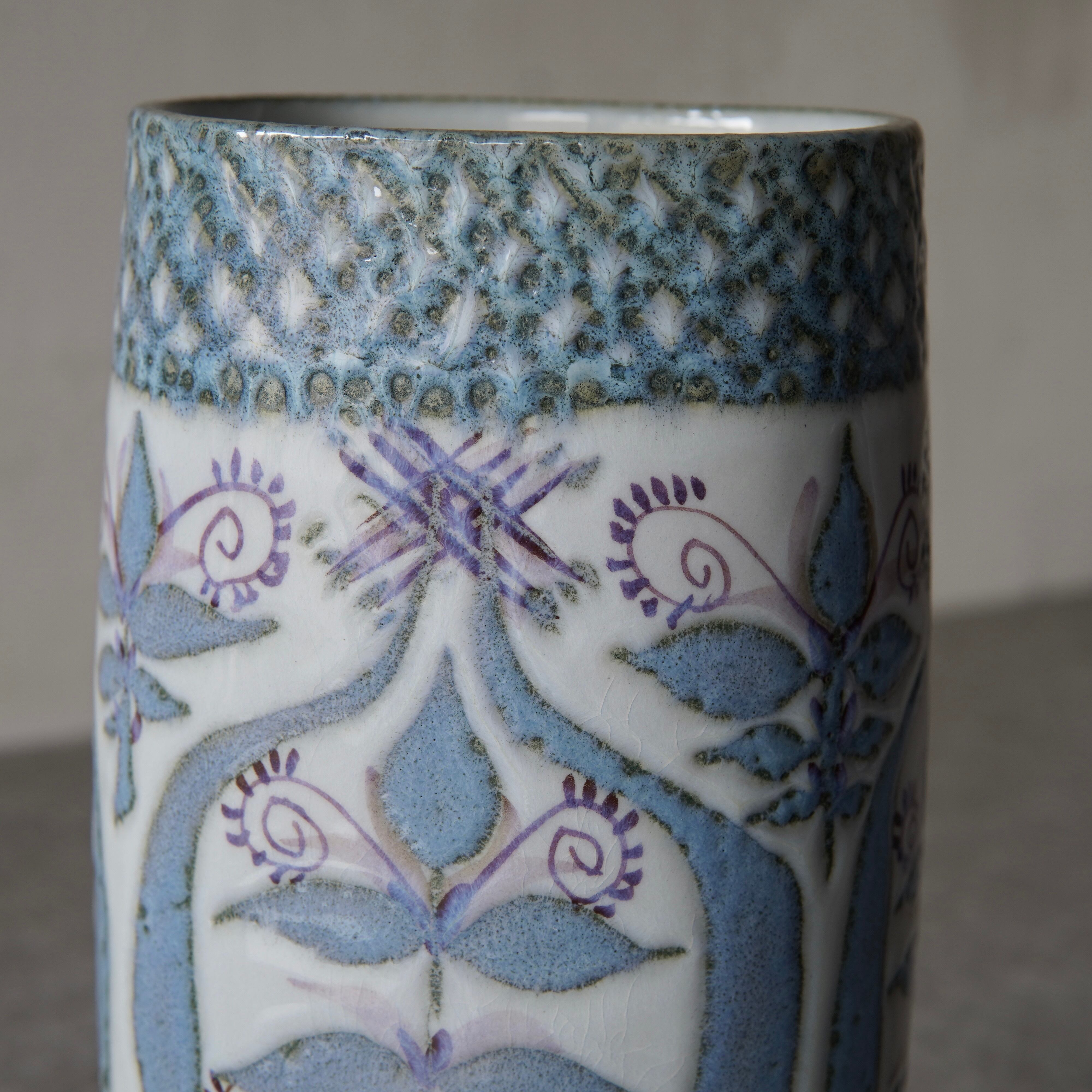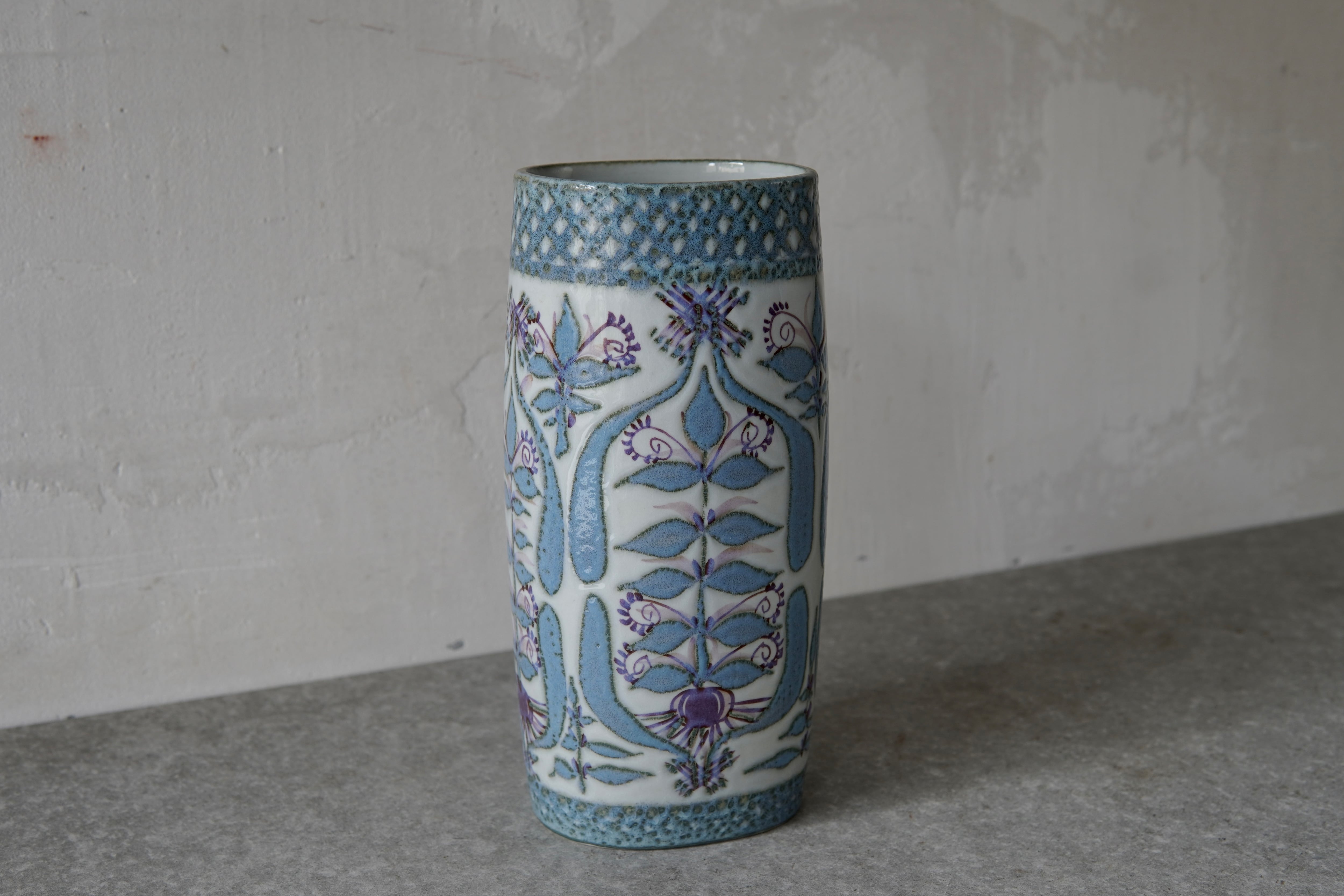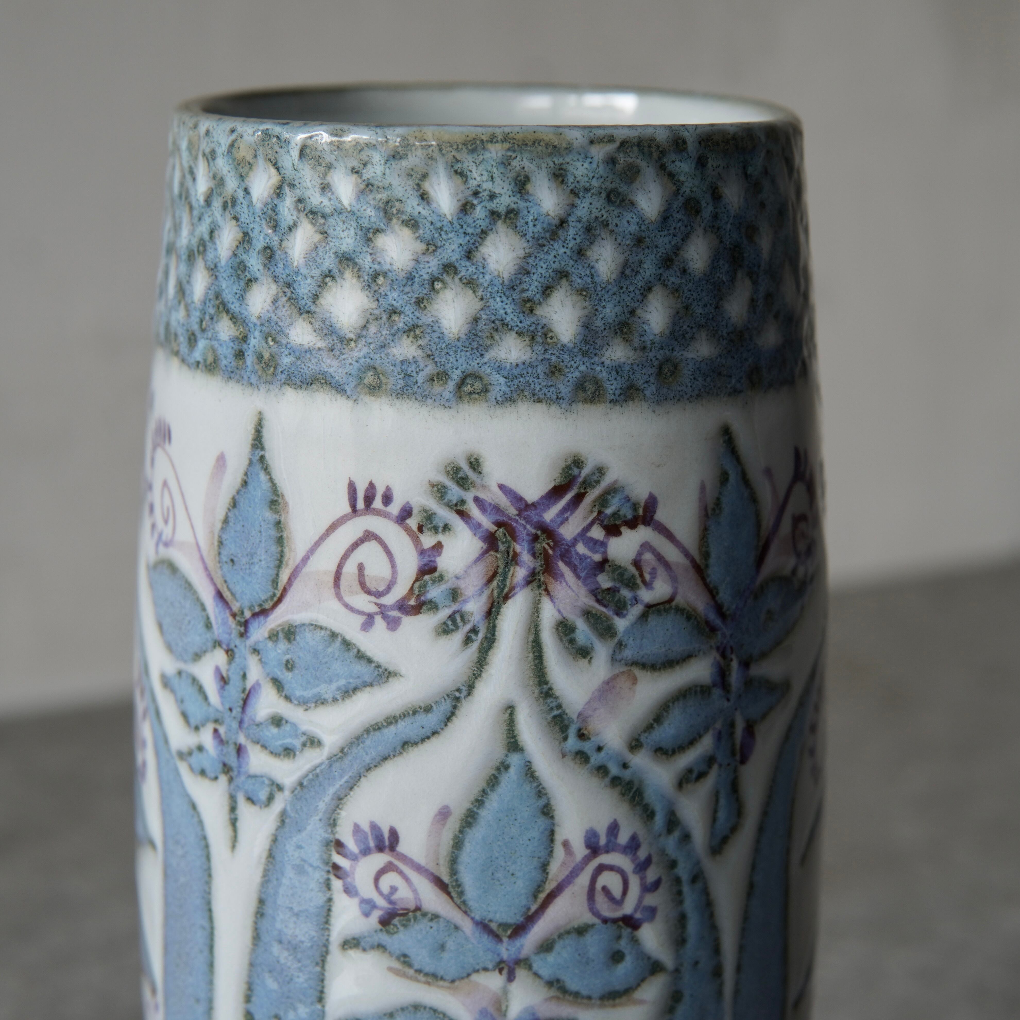 こちらの花瓶はMarianne Johnson(マリアンヌ・ジョンソン)によるデザイン。植物などの図柄がペールブルーやパープルでペインティングされています。しっとりとして上品な印象ながら、華やかな存在感も纏った花瓶です。