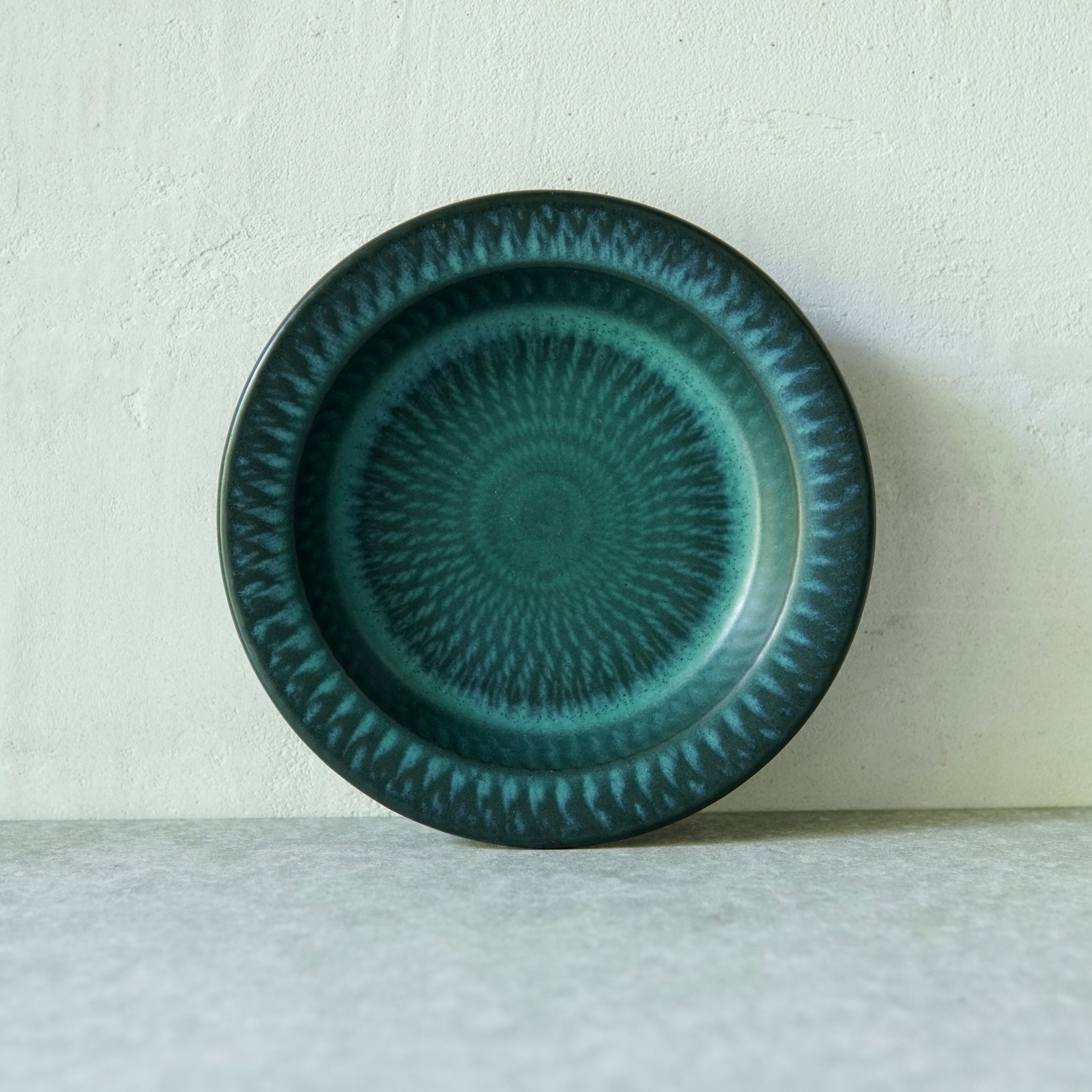 深みのあるターコイズブルーの釉薬と、表面に付けられた波線模様が美しい逸品は、